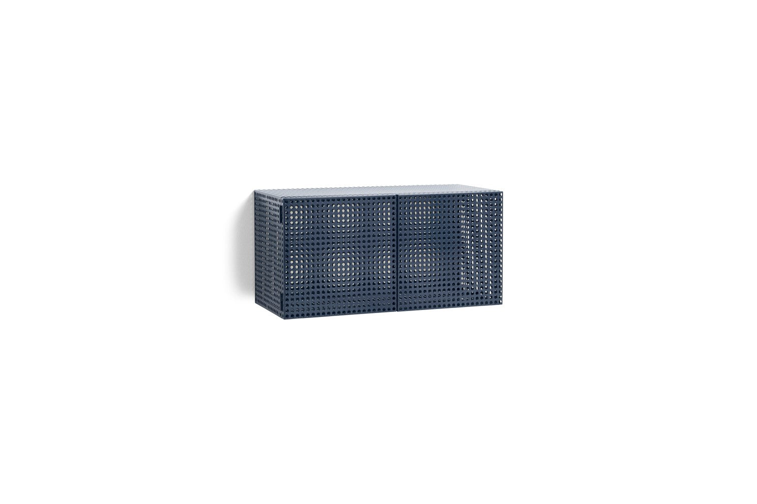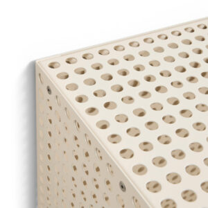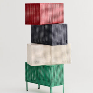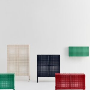 Defined by Muller Van Severen’s characteristic use of colour, form, and function, the Perforated Cabinet is a series of storage units that blend utility with bold aesthetics. The semi-transparent holes subtly conceal the contents while maintaining a sense of organisation. Available as wall-hanging and floor-standing variants, both featuring a magnetic door closure, they offer a practical and visually appealing solution for arranging and storing objects. Crafted in powder-coated steel, the cabinets come in different sizes and colours, providing a versatile storage solution for a wide range of domestic and public environments.